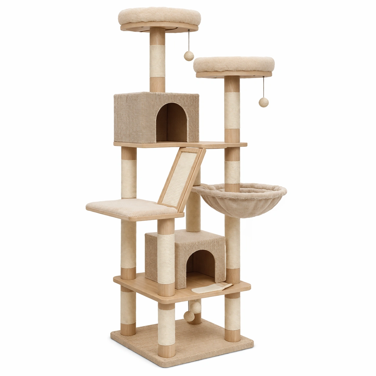 Árbol para gatos de madera y tejido beige con rampa y hamaca