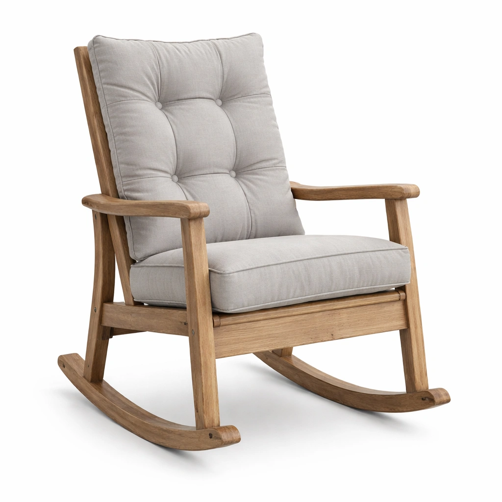 La mecedora cuenta con una estructura fabricada en madera de roble y cojines de tela de poliéster en color gris.