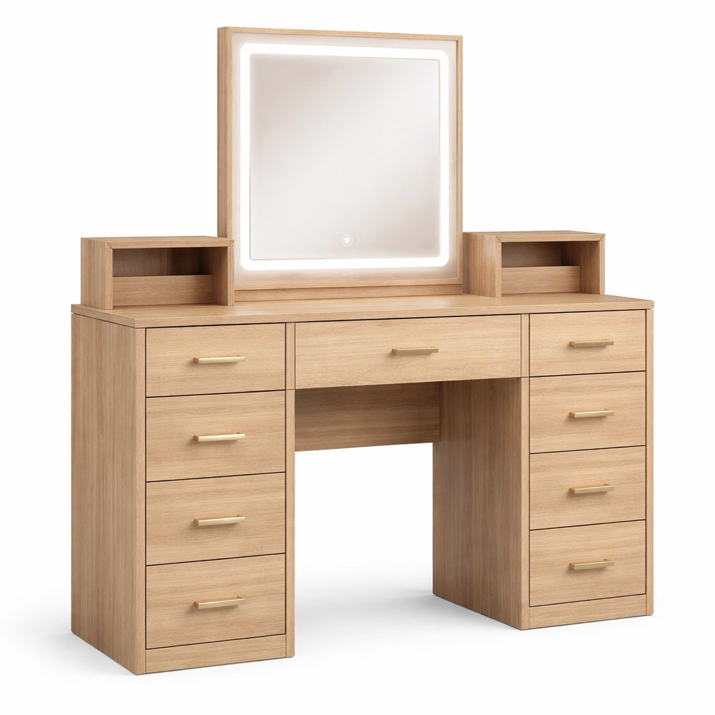 Este tocador está fabricado con tablero MDF con un acabado en roble claro. El espejo cuadrado incorpora iluminación LED integrada. Cuenta con un total de 9 cajones que ofrecen amplias opciones de almacenamiento. Se requiere autoensamblaje.